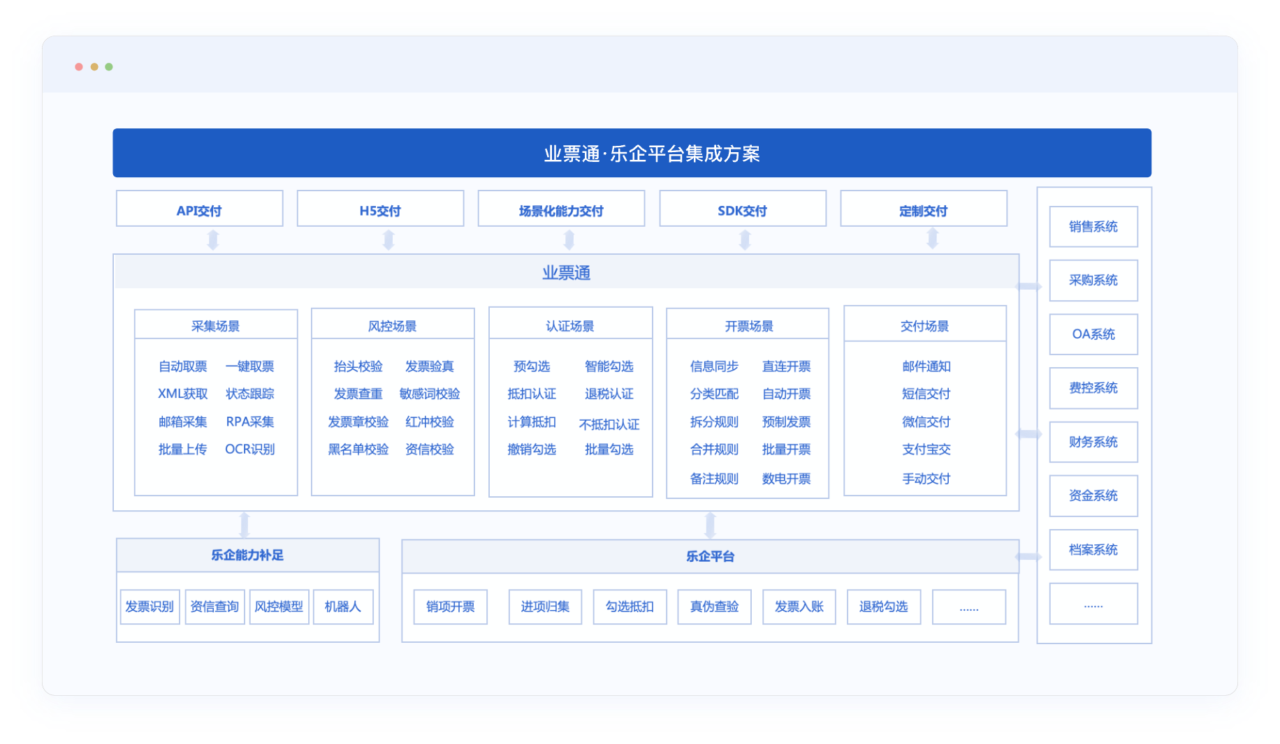 业票通可作为乐企的前置系统,将乐企平台的开票等接口功能进行功能化、流程化封装...